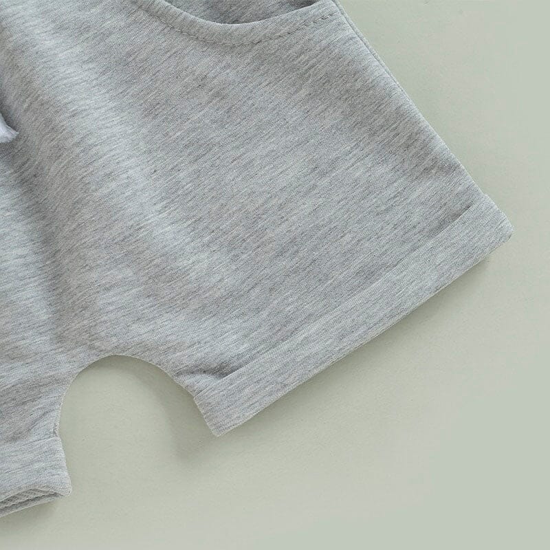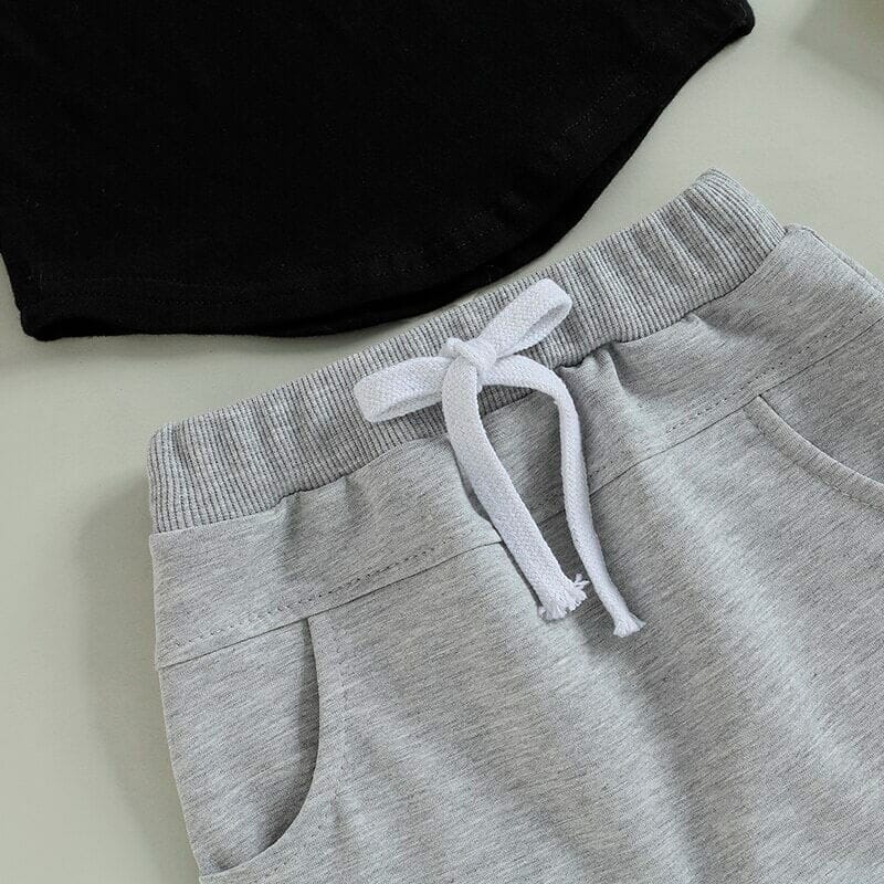 This little boy's summer outfit is perfect for the warm weather with its sleeveless solid top featuring a cute front pocket, paired with solid gray shorts. Made with comfortable and breathable materials, your little one can play and explore with ease while looking stylish and on-trend. The versatile colors of this set make it easy to mix and match with other pieces in your child's wardrobe, making it a great addition to any toddler's summer collection.