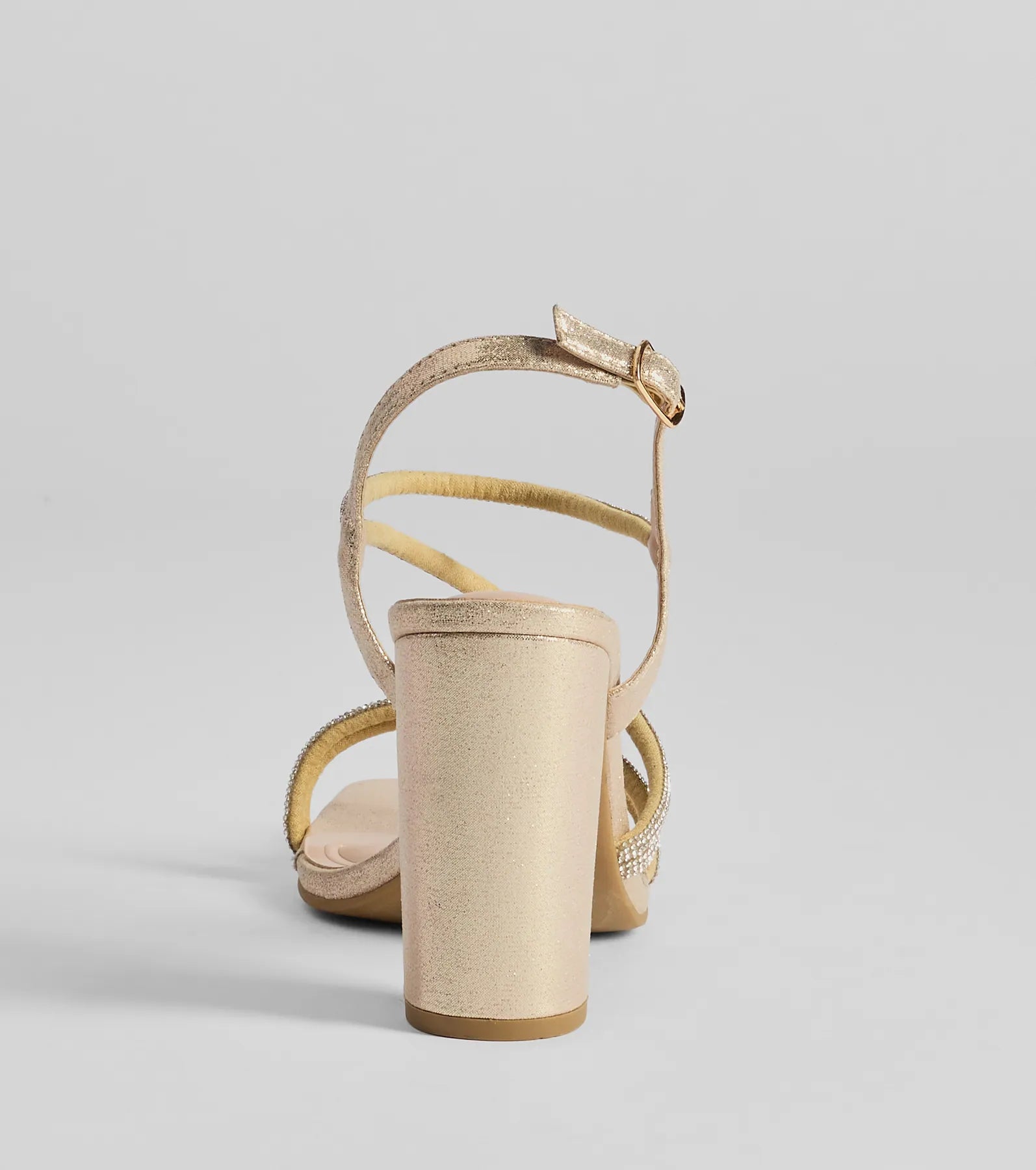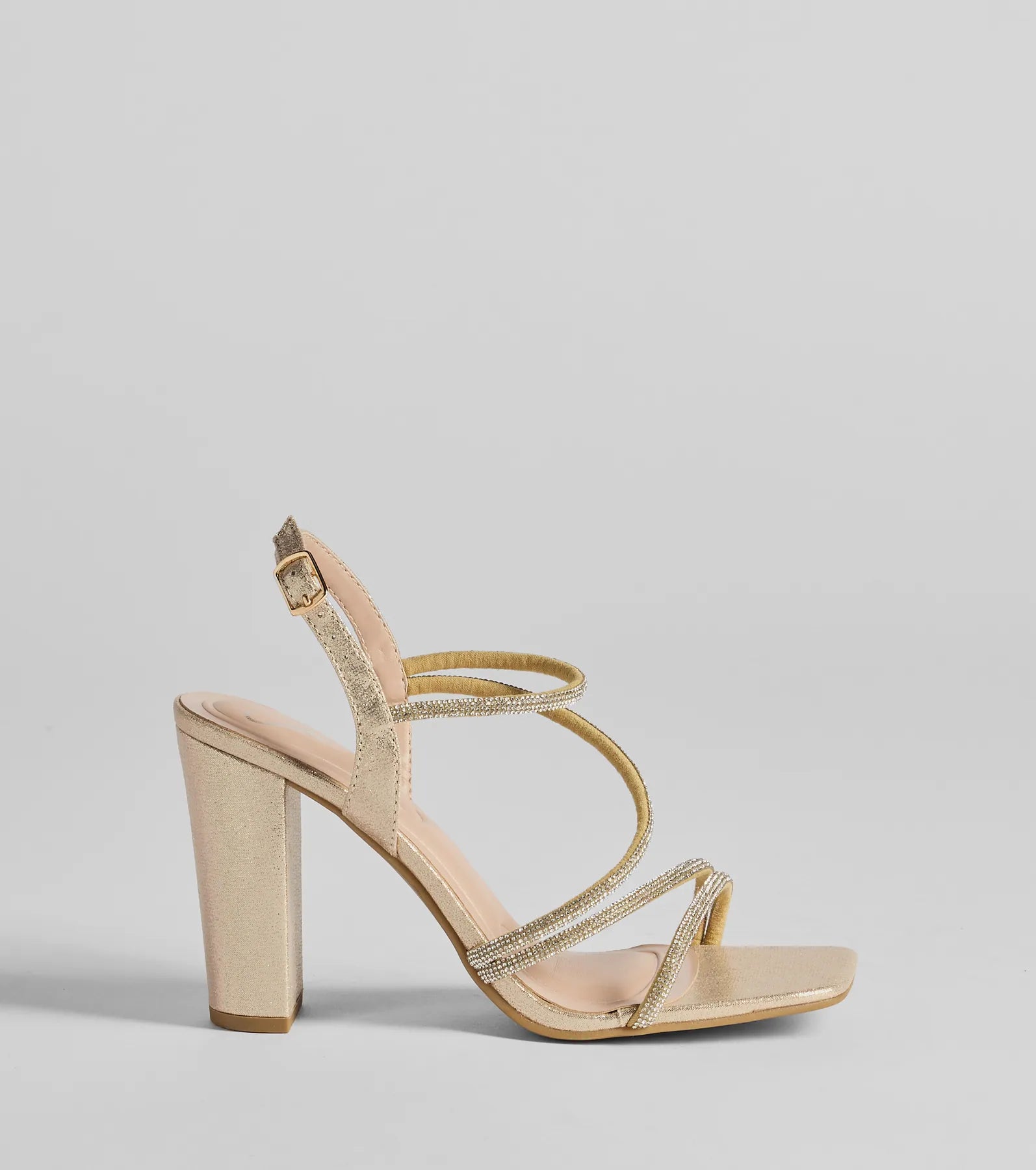Unlock glamour in these strappy rhinestone block heels with a luxe fit cushioned insole for comfort with every step without minimizing style!